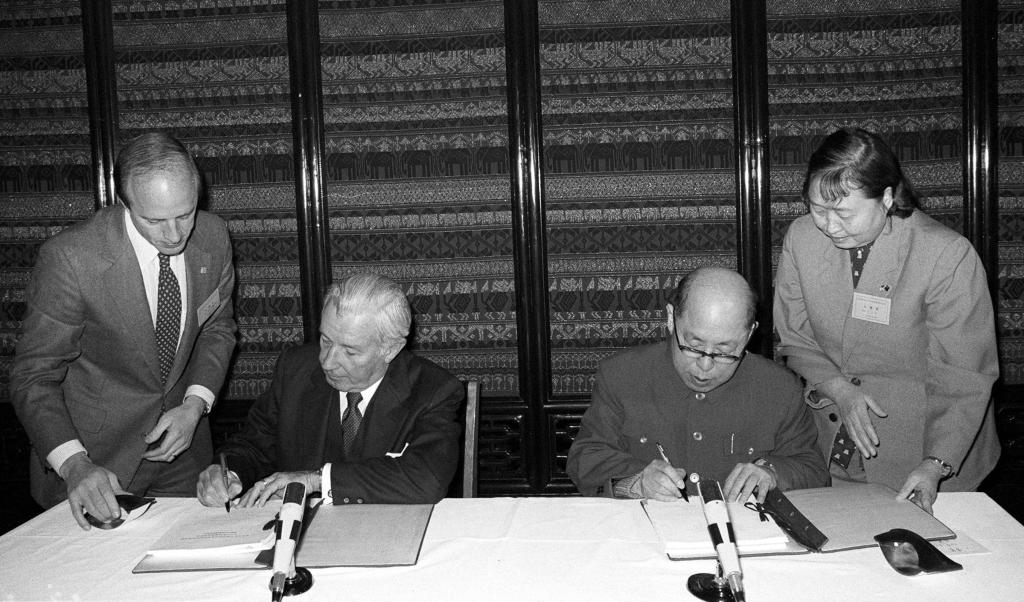 1984年3月21日,王丙乾同志和美国财政部长唐纳德·里甘分别代表两国政府草签协定。