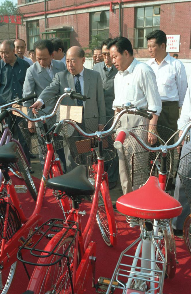1990年6月3日,王丙乾同志在天津自行车厂考察。