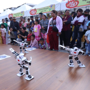 12月14日,在柬埔寨金边,人们在“走读中柬”系列文化活动文化市集上观看机器人表演。