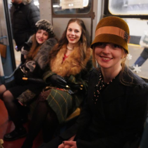12月14日,在美国纽约,人们身着怀旧服饰准备乘坐“怀旧地铁”。