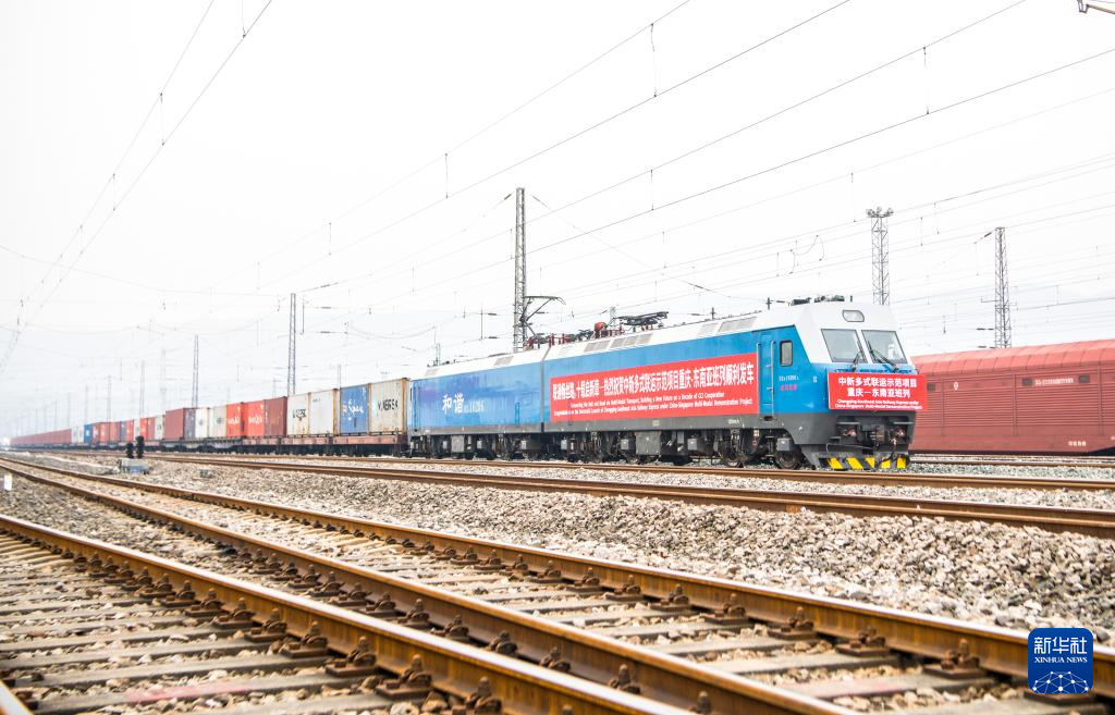 12月15日,一列装载化工产品、摩托车零配件等货物的中新多式联运示范项目重庆—东南亚班列缓缓驶出重庆鱼嘴站,将向南经广西钦州以铁海联运方式发往新加坡。与此同时,另一条轨道上,一列装载汽车KD件的中新多式联运示范项目重庆—中亚国际班列同步发车,将向西经阿拉山口以国际铁路联运方式发往哈萨克斯坦。