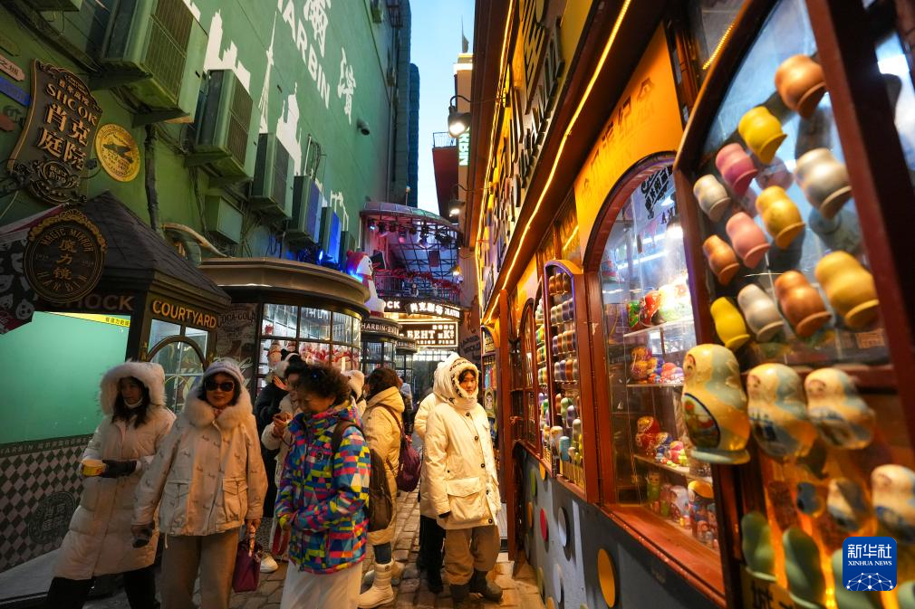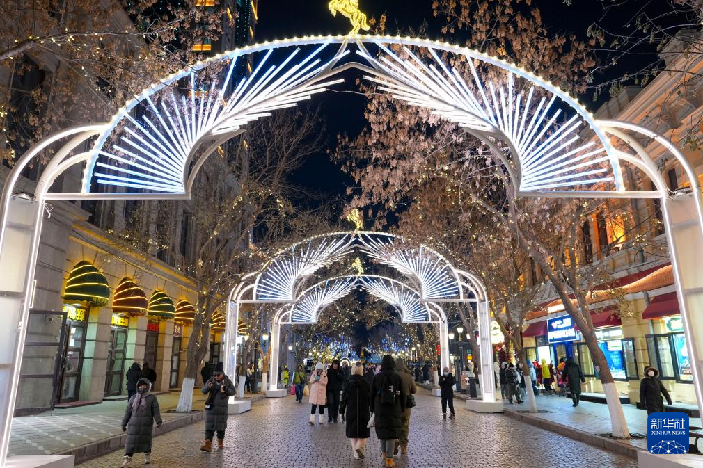 12月以来,哈尔滨进入冬季旅游旺季,中央大街上游人如织。作为哈尔滨市闪耀的城市名片,中央大街在丰富多彩的创意景观与灯饰装饰下显得格外动人。夜幕降临,华灯初上,游人徜徉其中,尽享当地独特文化魅力。