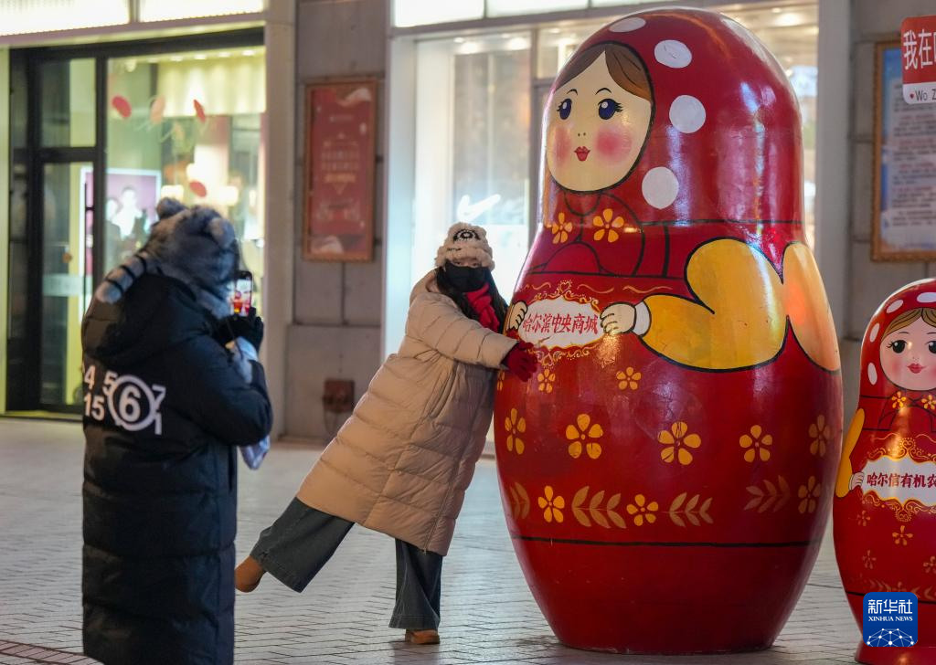 12月16日,人们在哈尔滨中央大街上的一处套娃景观前拍照。