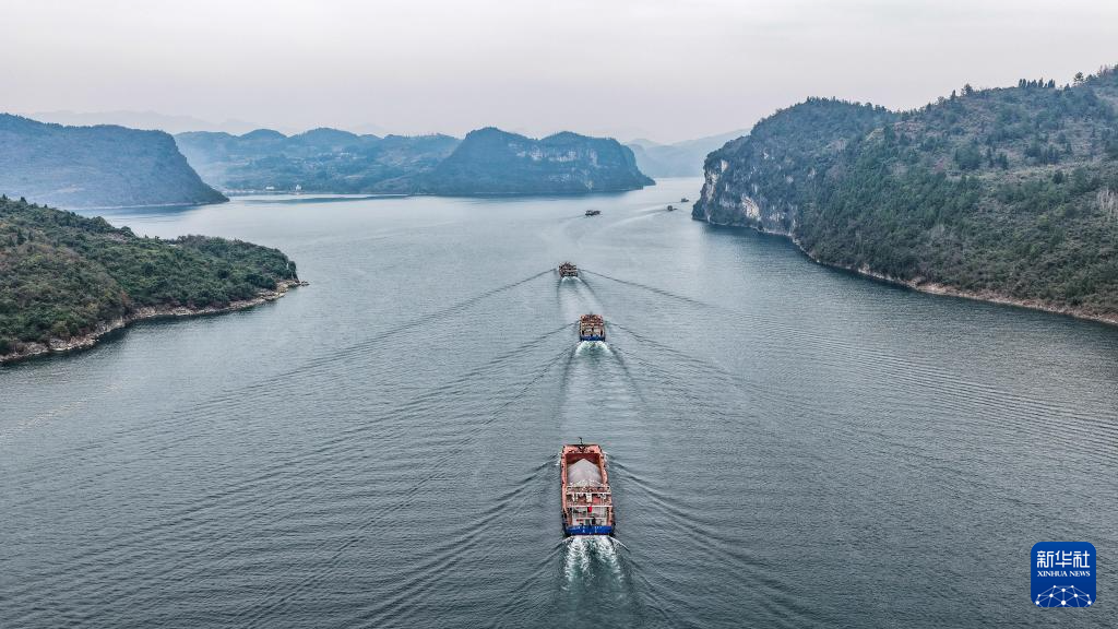 12月16日,货船从瓮安港云中港区启运出发(无人机照片)。
