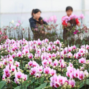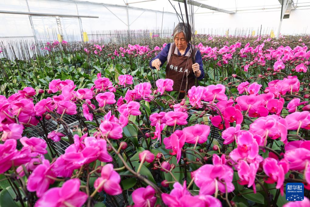 12月17日,工作人员在河北省石家庄市藁城区廉州镇一家花卉种植基地养护蝴蝶兰花卉。