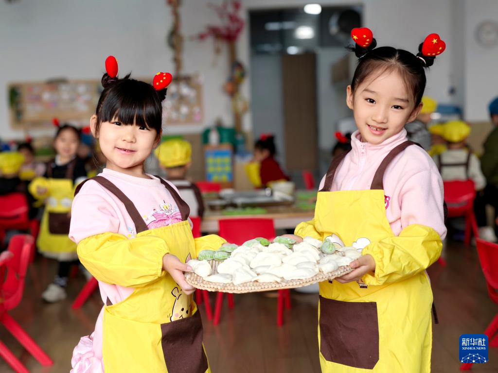 12月19日,在河北省石家庄市栾城区第二幼儿园,小朋友展示他们包的饺子。