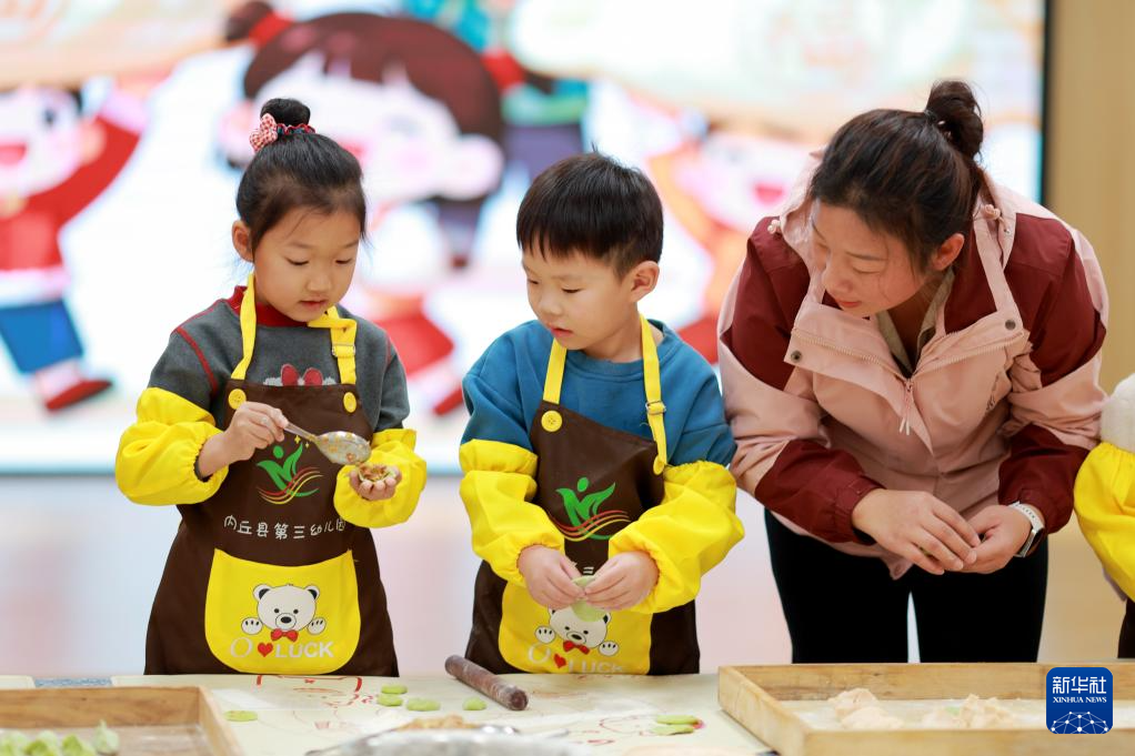 12月19日,在河北省石家庄新乐市市直第二幼儿园,老师教小朋友包饺子。