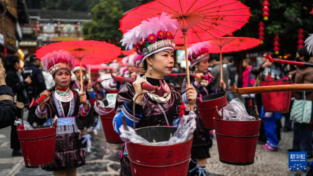 12月20日,肇兴侗寨的展演队伍在行进中。