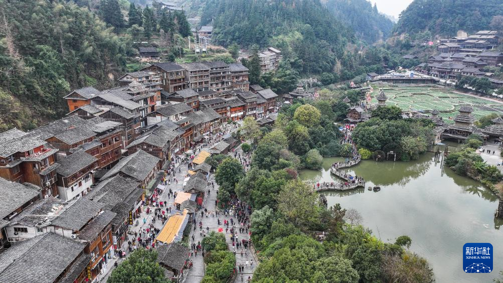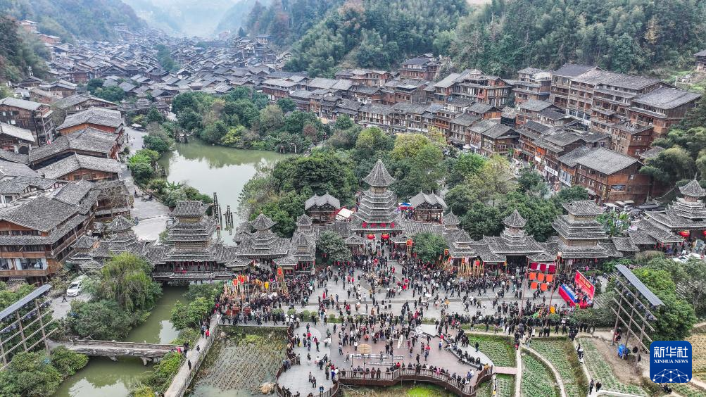 12月20日,游客与侗族群众在肇兴侗寨正门欢庆侗年(无人机照片)。