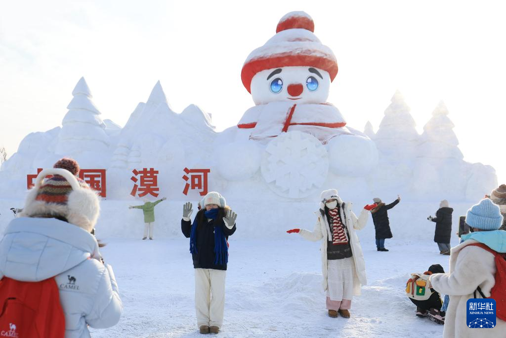 12月23日,游人在漠河站站前广场与“最北大雪人”合影。