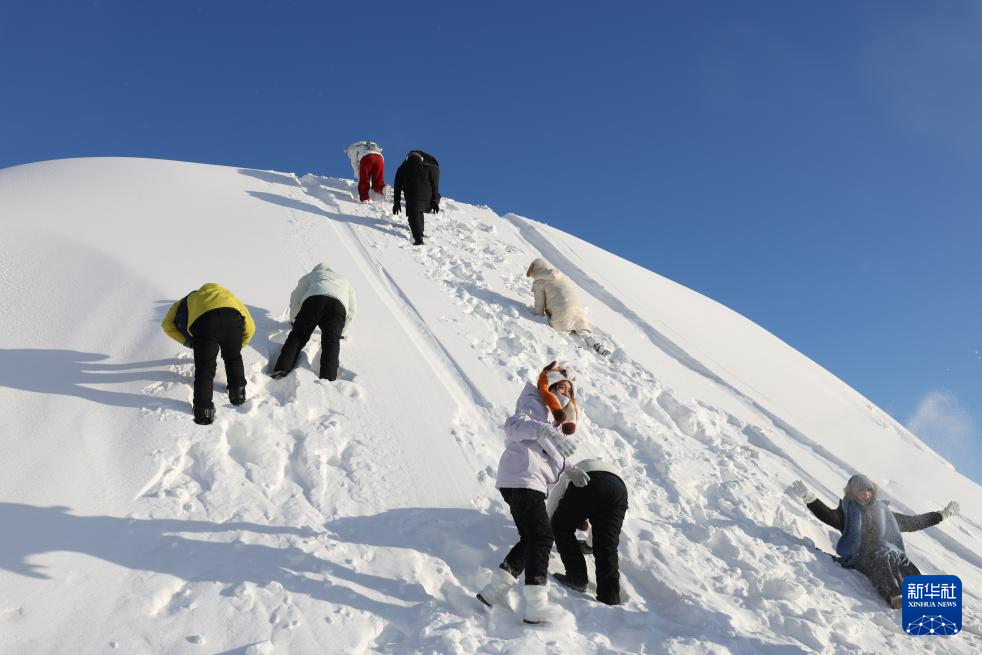 12月27日,游人在漠河市北极村攀爬雪坡。