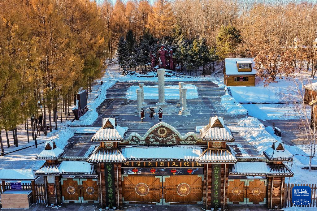 在黑龙江省佳木斯市同江市街津口赫哲族乡,赫哲族群众在民族文化村里进行文艺活动(无人机照片,2025年11月18日摄)。