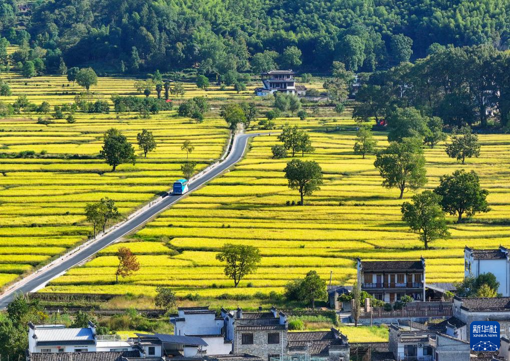 这是安徽省黄山市黟县宏村镇塔川村稻田景色(无人机照片,2025年10月16日摄)。