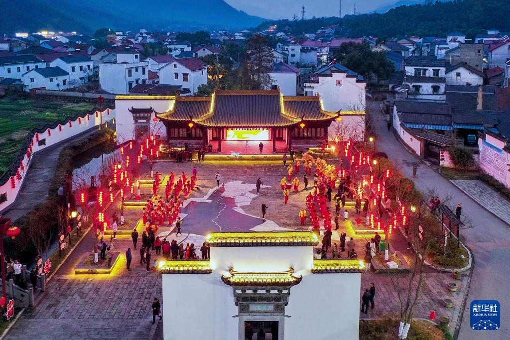 在浙江省湖州市安吉县鄣吴镇鄣吴村八府广场,当地群众举办元宵节非遗踩街活动(无人机照片,2022年2月14日摄)。