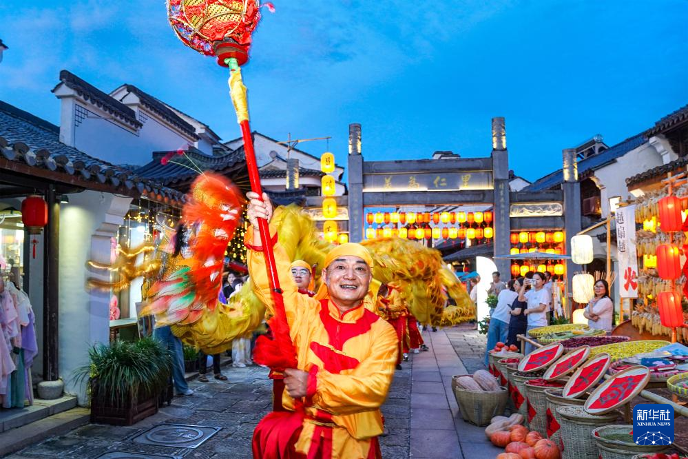 浙江省湖州市安吉县鄣吴镇鄣吴村,人们舞动鄣吴金龙在归仁里老街进行非遗踩街庆丰收活动(2025年9月12日摄)。
