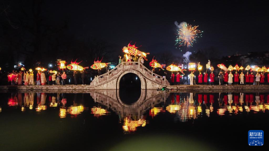 花灯表演队在安徽省黄山市黟县宏村巡游(无人机照片,2025年2月11日摄)。