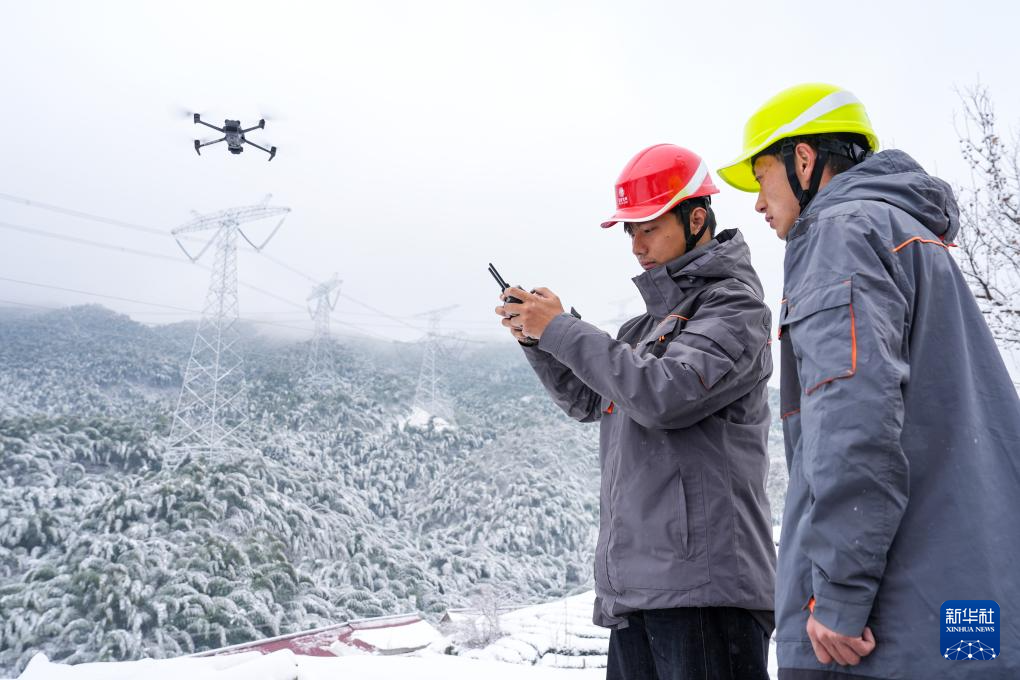2026年1月1日,在安徽省金寨县,安徽送变电工程有限公司运维工人利用无人机巡检输电线路。