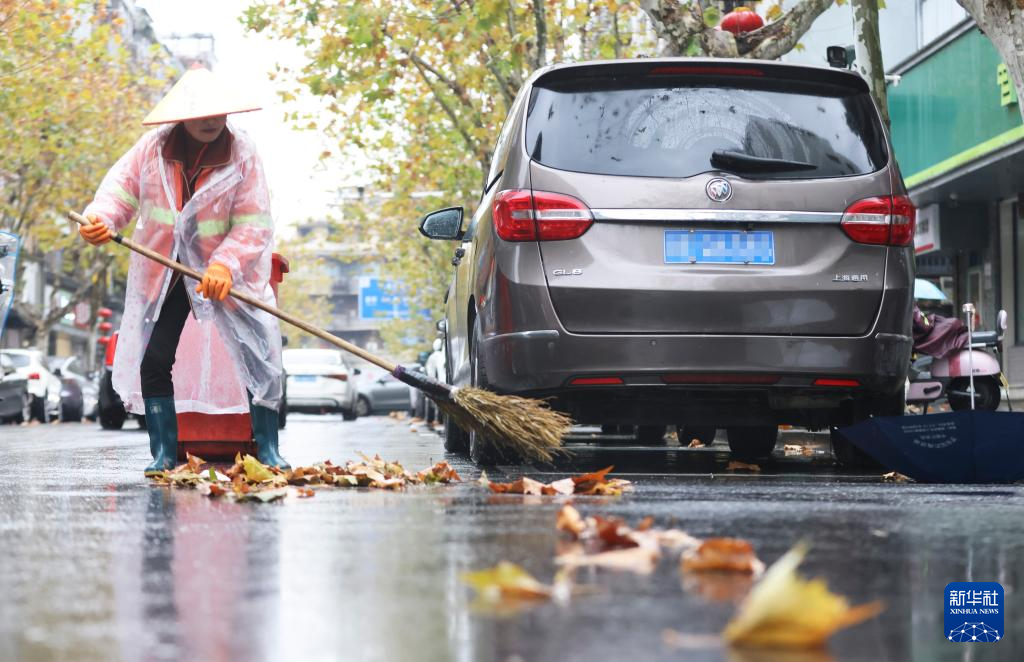 2026年1月1日,环卫工人冒雨在浙江省德清县乾元镇清扫路面。