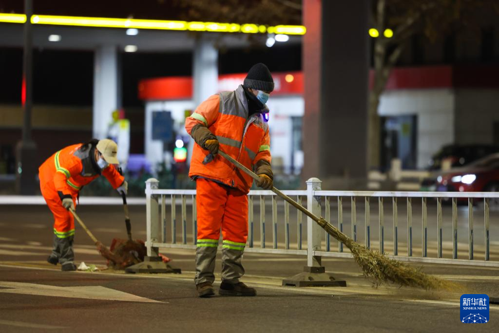 2026年1月1日凌晨,河北省石家庄市新华区环卫工人在清扫街道。