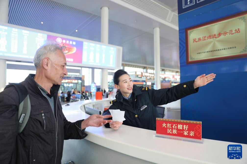 2026年1月1日,昆明南站12306客服中心工作人员(右)为旅客提供服务。