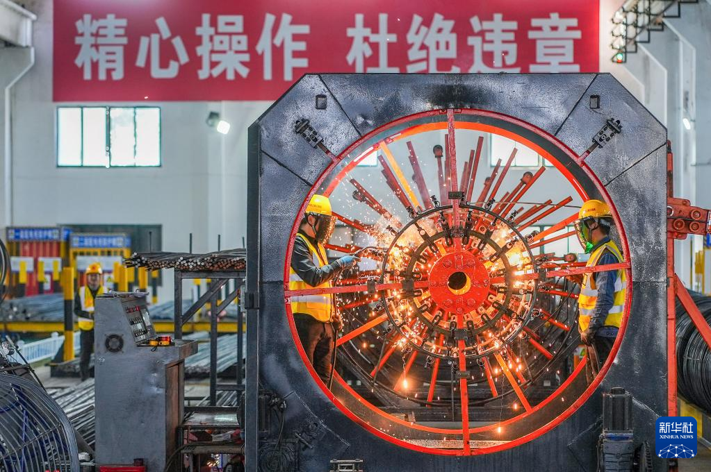 2026年1月1日,工人在位于江苏省兴化市的中铁上海工程局盐宜铁路项目部钢筋加工场进行焊接作业。