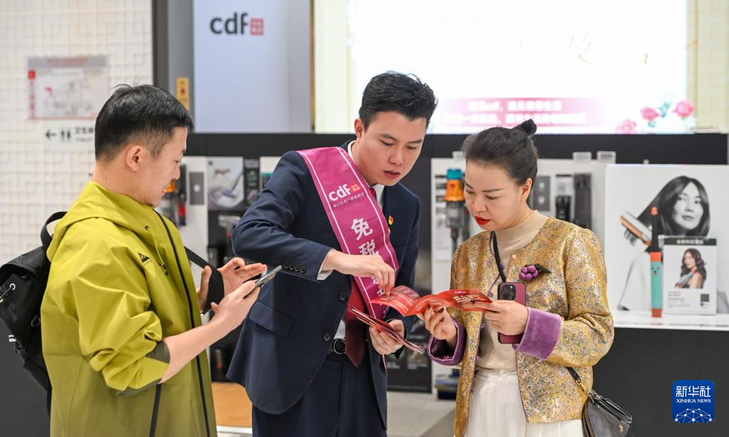 在中免集团海口日月广场免税店,工作人员在向游客介绍免税政策(1月1日摄)。