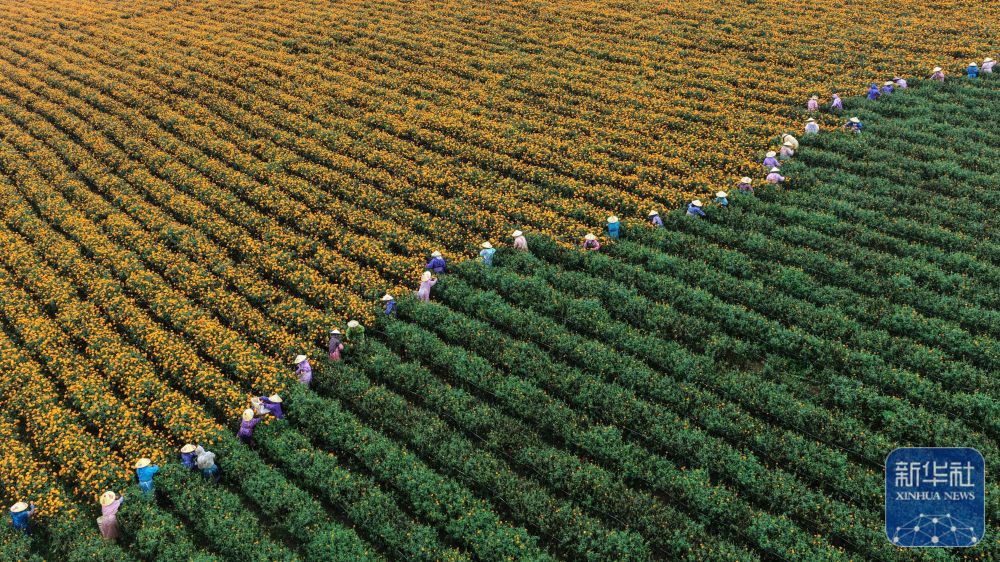 ↑2025年8月23日,农民在云南省腾冲市明光镇凤凰村凤凰山上采收万寿菊(无人机照片)。新华社发(龚祖金 摄)