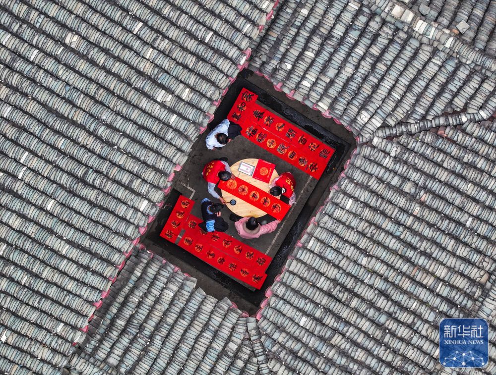 ↑2025年1月22日,在湖南省永州市道县梅花镇贵头村,文化志愿者在写春联(无人机照片)。新华社发(蒋克青 摄)