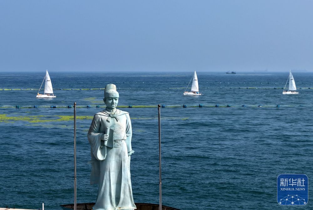 ↑2025年7月10日,在青岛银海大世界港池外,参加海上巡游的帆船从郑和雕像旁驶过(无人机照片)。2025年是中国航海日设立20周年,也是郑和下西洋620年。新华社记者 李紫恒 摄