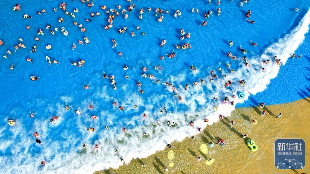 ↑2025年7月5日,浙江省湖州市长兴县太湖图影旅游度假区龙之梦乐园嬉水世界,游客亲水消暑(无人机照片)。新华社发(吴拯 摄)