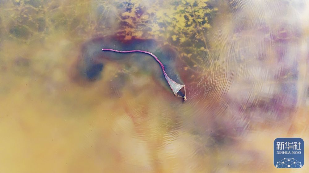 ↑2025年6月8日,捕捞人员在山西省运城市盐湖内进行捕捞盐水虫作业(无人机照片)。新华社发(姜桦 摄)