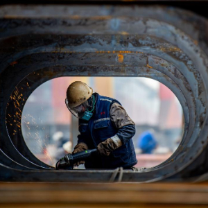 1月5日,江苏泰州口岸船舶有限公司厂区内,工人进行打磨作业。
