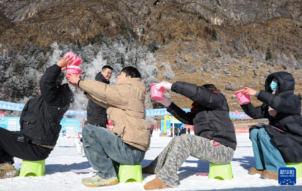 1月5日,游客在理县毕棚沟滑雪场里玩“传雪挑战”游戏。