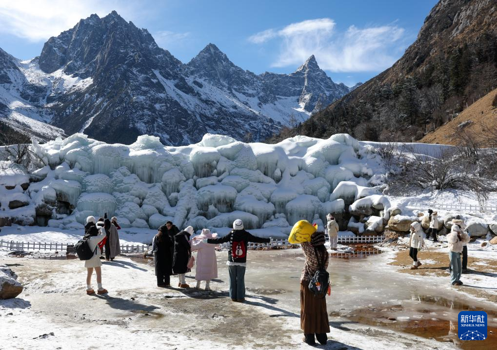 1月5日,在理县毕棚沟滑雪场,游客在冰瀑前留影。