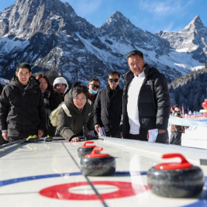 1月5日,游客在理县毕棚沟滑雪场里玩桌面冰壶球。