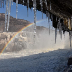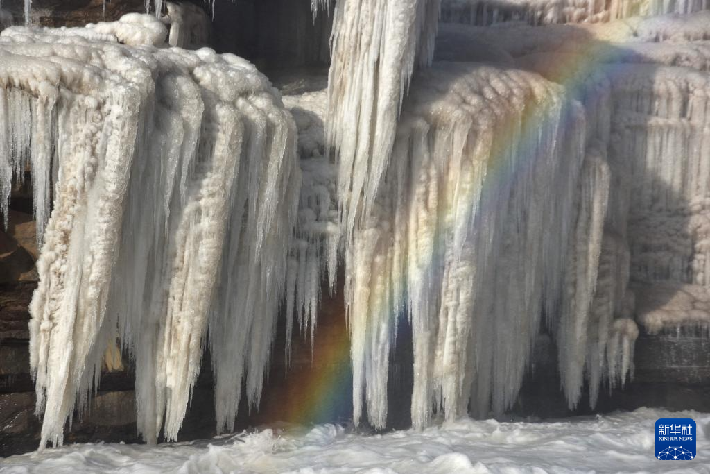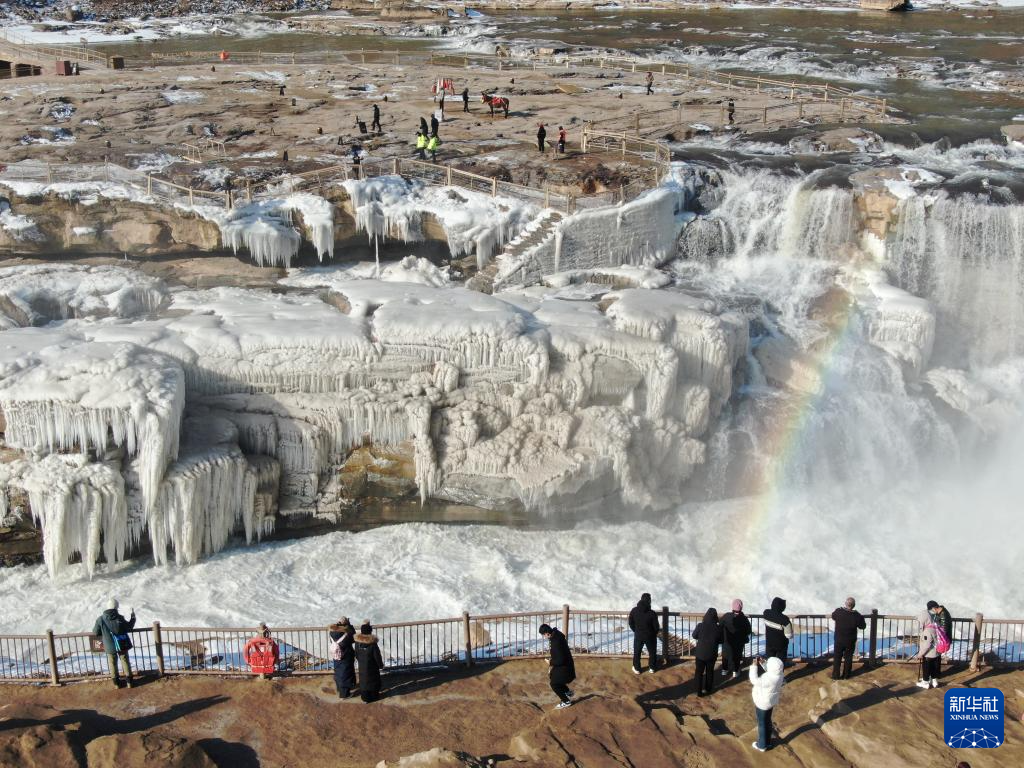 受持续降温天气影响,位于山西吉县和陕西宜川县交界的黄河壶口瀑布形成“冰瀑玉壶”壮美景观,层层叠叠的冰瀑与瀑布上空的彩虹相映成趣,美不胜收。