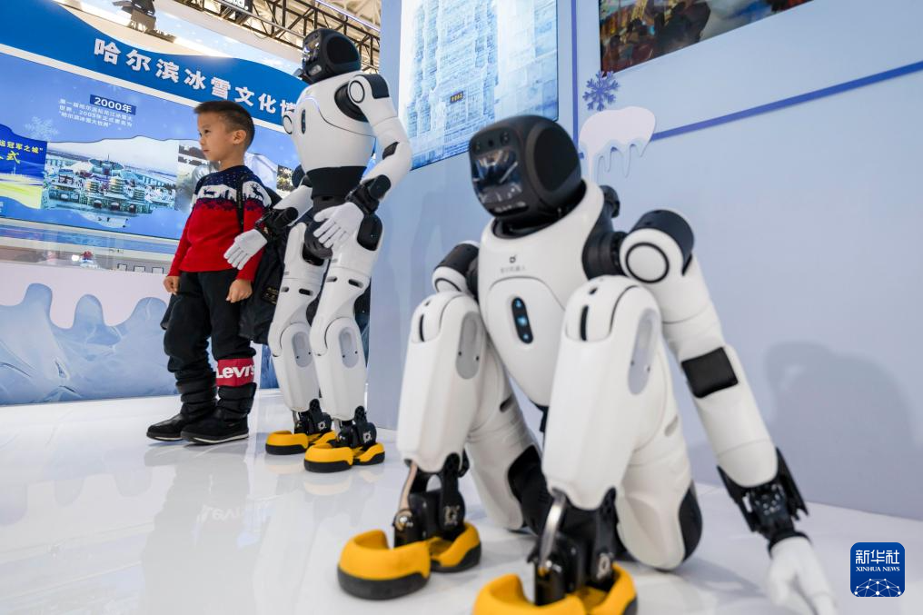1月6日,在2026哈尔滨国际冰雪经济博览会现场,一名小朋友和机器人合影。