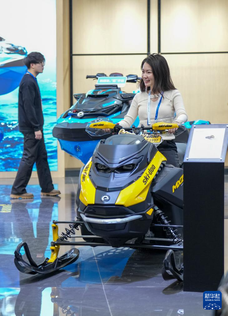 1月6日,在2026哈尔滨国际冰雪经济博览会展会现场,参观者体验乘坐雪地摩托。