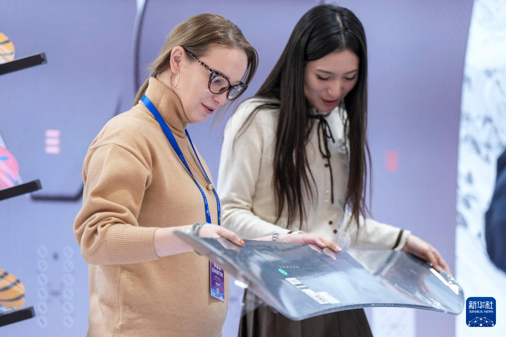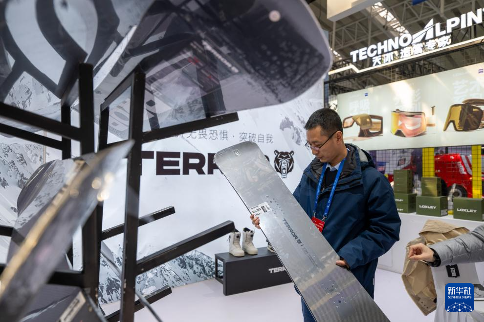 1月6日,参会嘉宾在2026哈尔滨国际冰雪经济博览会现场观看滑雪板。