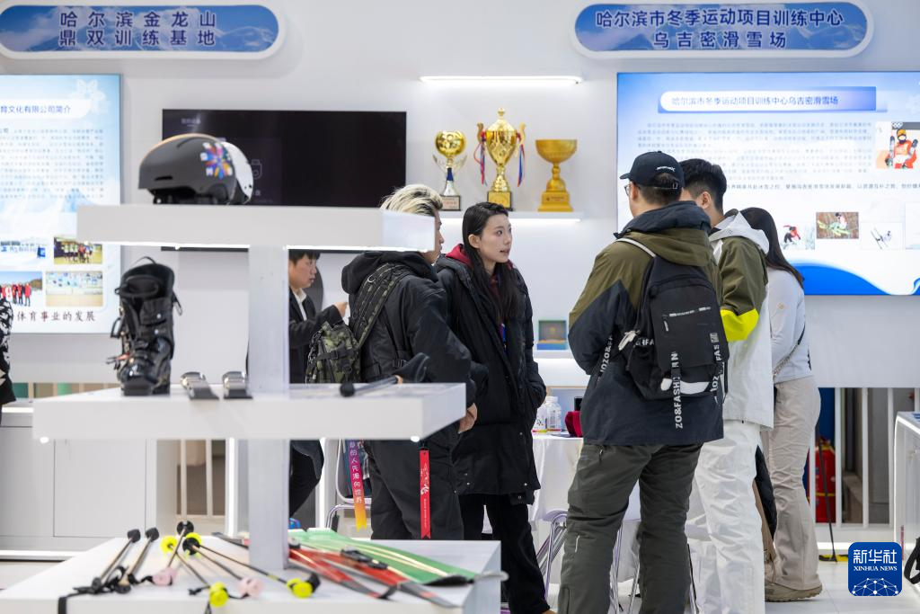 1月6日,在2026哈尔滨国际冰雪经济博览会展会现场,参观者在咨询一款碳纤维滑雪板性能。