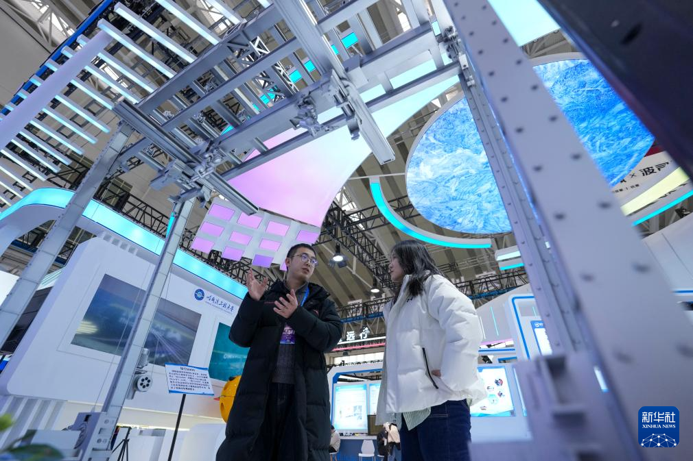1月6日,在2026哈尔滨国际冰雪经济博览会展会现场,参会嘉宾(左)为参观者介绍智能碳纤维滑雪板性能。