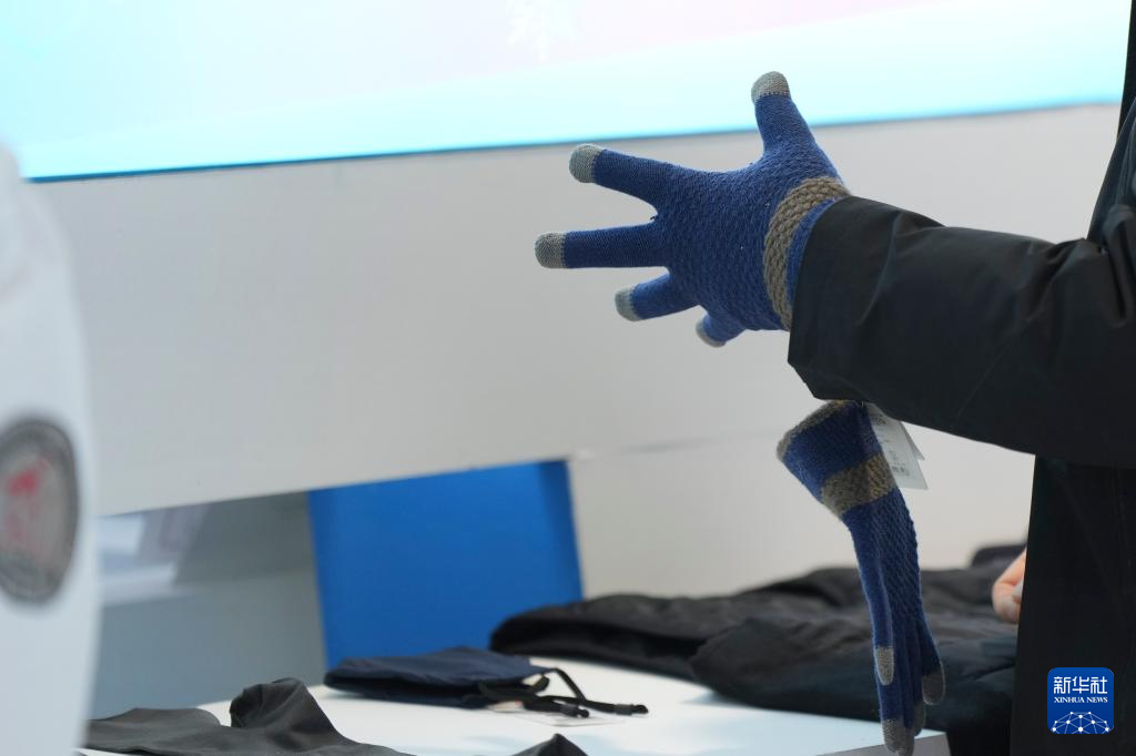 1月6日,在2026哈尔滨国际冰雪经济博览会展会现场,一名参观者在试戴一款石墨烯保暖手套。