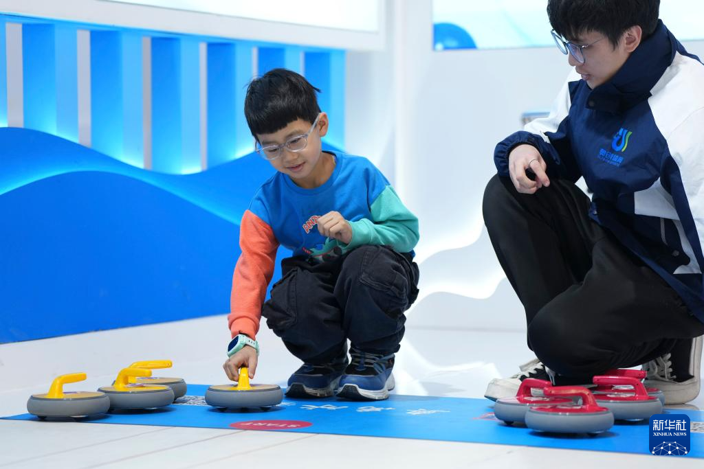 1月6日,在2026哈尔滨国际冰雪经济博览会展会现场,小朋友体验投掷冰壶。