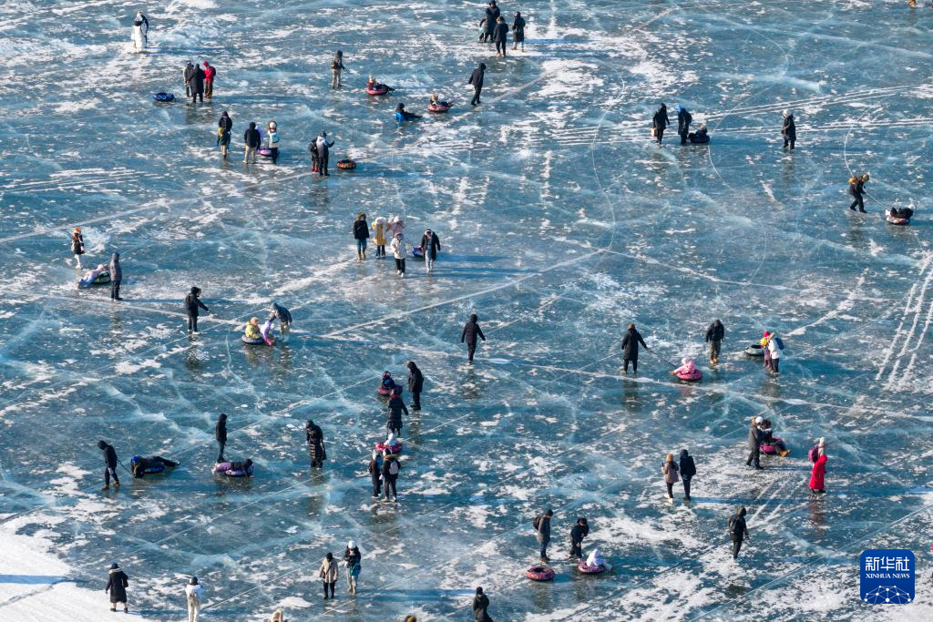 2026年1月1日,游人在哈尔滨市道里区松花江冰面上游玩(无人机照片)。