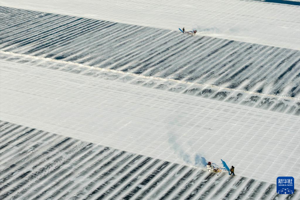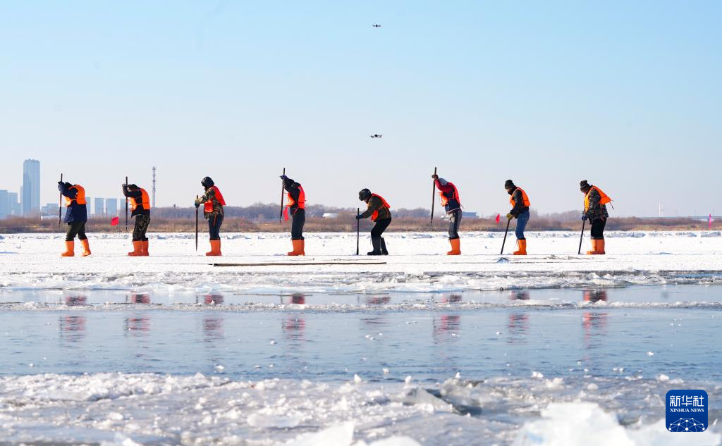 2025年12月9日,工人在松花江哈尔滨段采冰(无人机照片)。