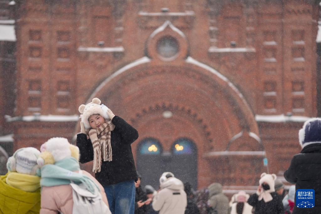 2025年12月23日,游人冒雪在哈尔滨建筑艺术广场留影。