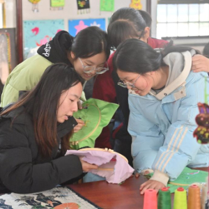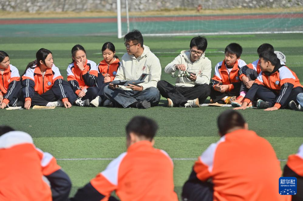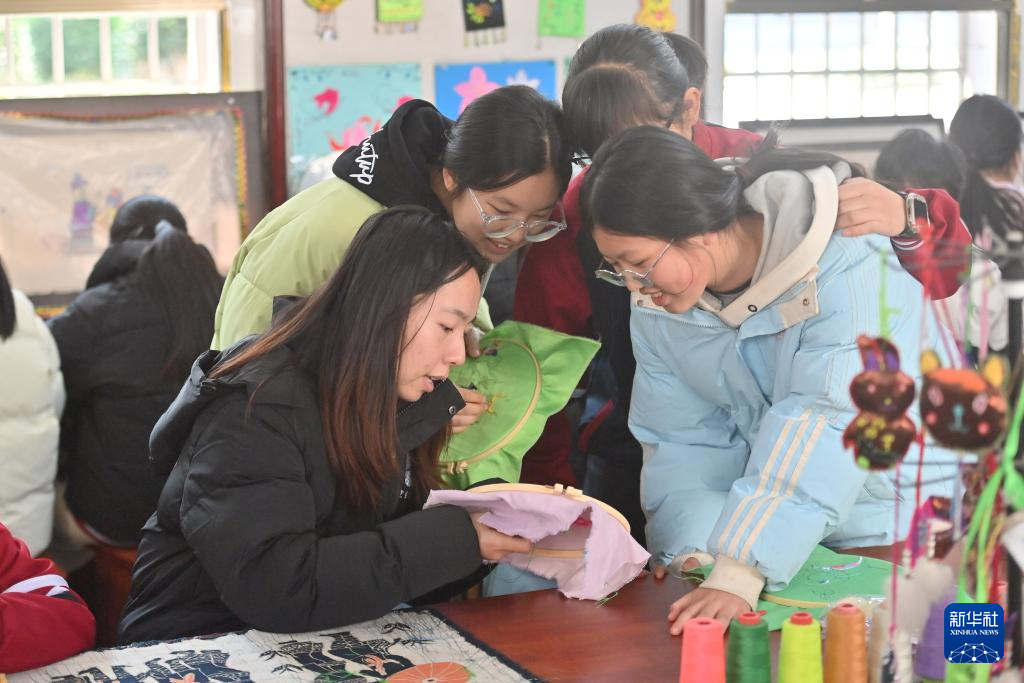 1月7日,在融水苗族自治县民族中学,西北工业大学研究生支教团成员宋述钰(左一)在非遗课堂上与学生交流。