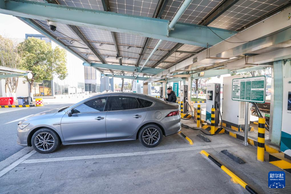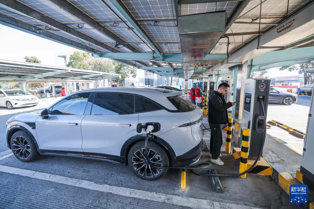 1月7日,在G50沪渝高速长兴服务区,新能源车主使用新安装的大功率充电桩给车充电。