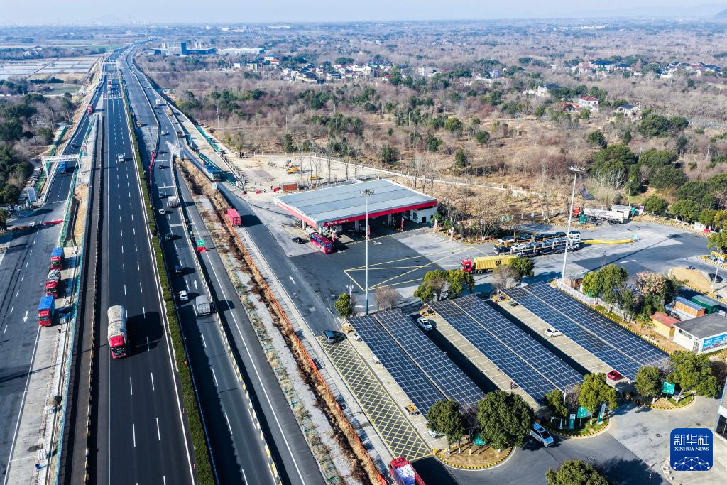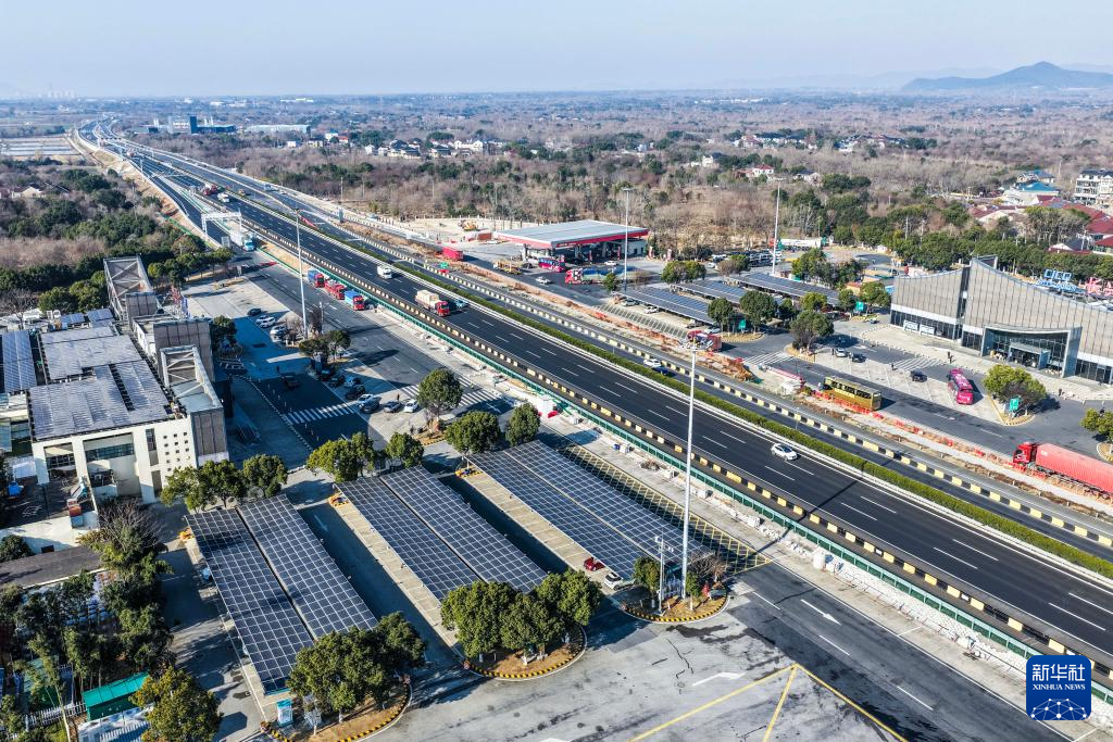 1月7日,空中俯瞰G50沪渝高速长兴服务区,太阳能光伏板下是刚刚升级完成的高速服务区充电站(无人机照片)。