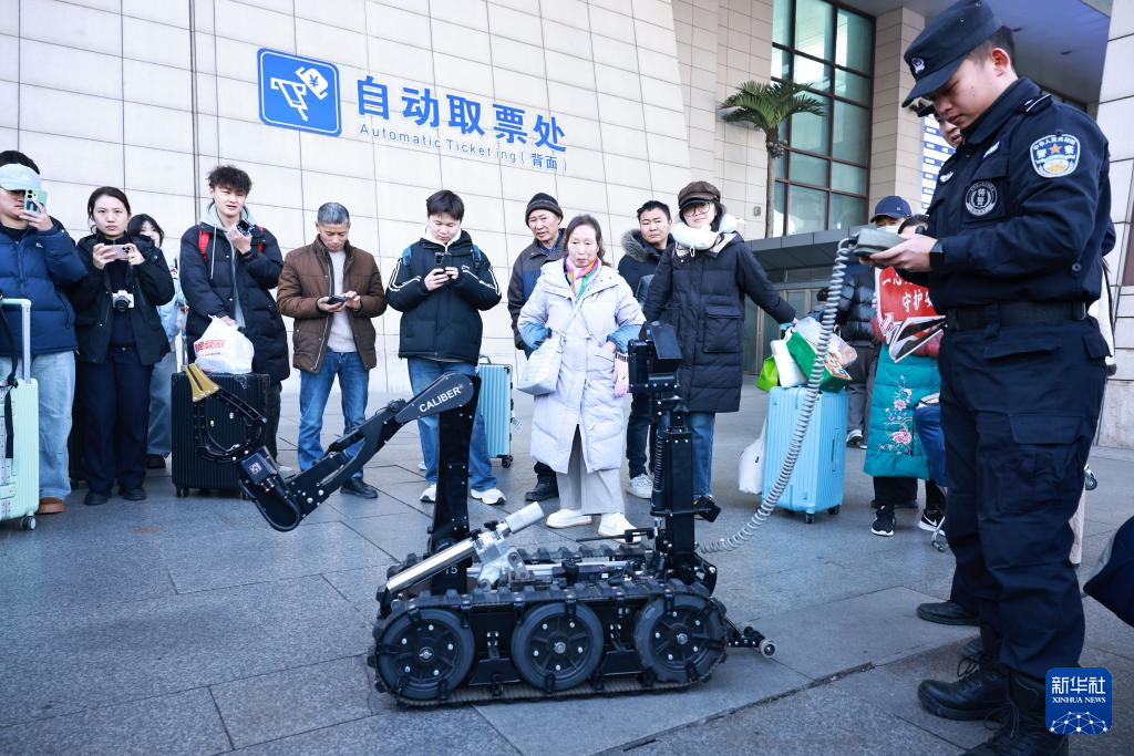 1月8日,在湖北省武汉市武昌站西广场,民警为旅客展示警用装备。